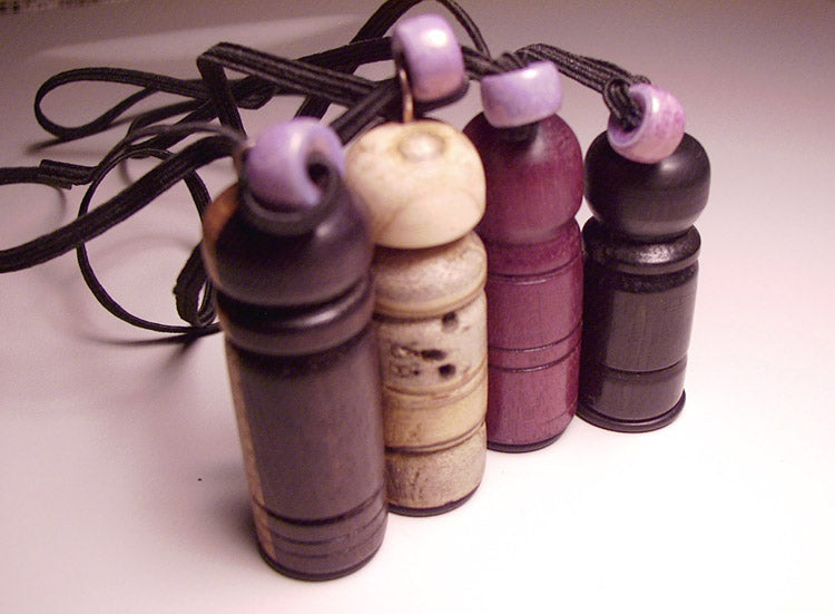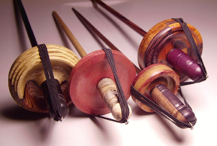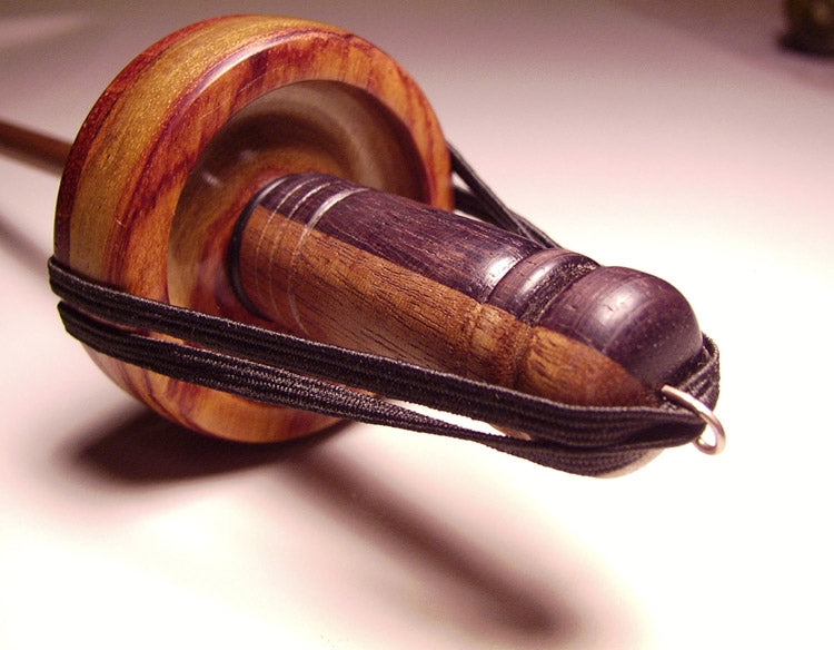 The Butcher's Crown fits snugly and sits firmly on the upper shaft and hook, protecting the hook from displacement, it also doubles as a wrist distaff, just take the Butchers Crown off of your spindle and slip the elastic over your wrist and presto! Instant wrist distaff. We make the Butchers Crown in a scrumptious variety of woods to mix and match with our lovely spindles. The Butchers Crown can also be made to custom order to fit most spindles, and almost any fine fiber.